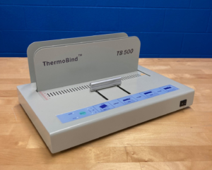 This binder can be used to glue loose sheets of paper or sewn signatures into soft- or hard-cover books with a neat, professional look. Ideal for binding reports and other documents. Maximum spine width of 2” or approximately 500 pages. Maximum book height is 12″. Works with a variety of thermal book binding covers.