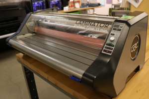 Use the laminator for paper or cardstock up to 24″ wide. The lamination roll is 25″ wide and 3 mil (0.003″) thick. Preheat time is 13 minutes.