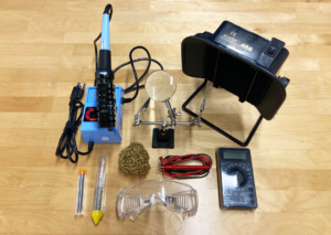 Soldering irons are used for melting solder and applying it to metals that are to be joined. They can be used to make jewelry, create circuits, and repair electronics. The soldering irons include helping hands, a magnifying glass, and an air filter.