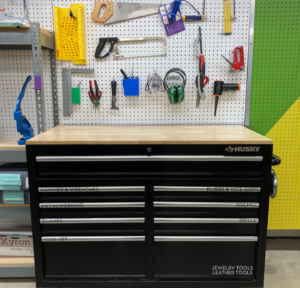 From screwdrivers to calipers, X-acto knives to cutting mats … you’ll find all sorts of odds and ends in the tool chest.